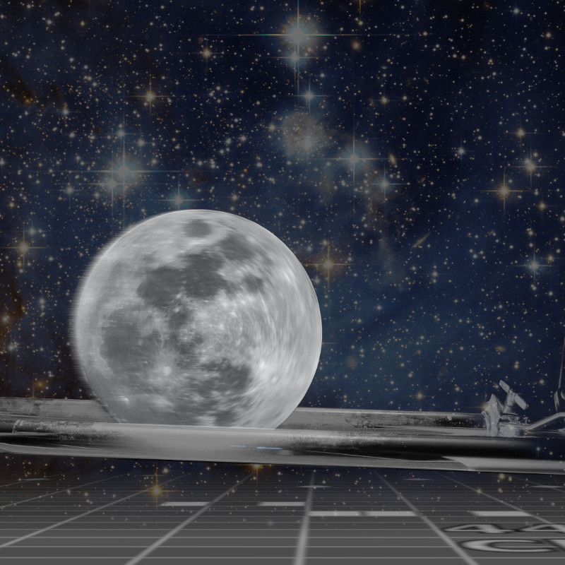 The image was also done by Heinz. He took pictures of a ball resting on the chrome bars of cymbal stands, replaced the ball with an image of the full moon, added motion blur, and added the night sky and piano roll views in the background. All of this was done in the GIMP.