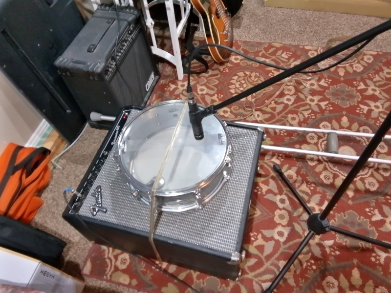 Second is a recording technique I read about in an interview article by recording engineer and producer Sylvia Massey. She described playing a drum track through a speaker with a snare drum strapped to the front of it, while placing a mic on the snare drum. This re-amping technique is useful for guitar and drum tracks when you want to add some character or crunch to the sound, and she recommended it especially for sampled drum tracks. I decided to try it out on Tom’s drum performance, which he performed on the Roland FA-06, and I thought that mixing in the re-amped snare drum gave it a nice organic punchy sound. I also took a cue from Sylvia Massey and used more hard Left-Center-Right panning, and I think that made for a nice clean mix.