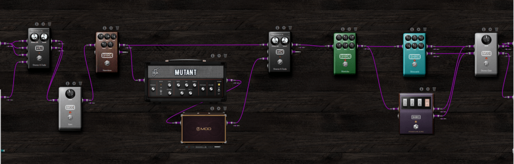The guitar sound I was aiming for was Andy Summers, from The Police. I don’t think I quite hit Summers, although the third verse was where I really tried to reach for him. This was definitely a Telecaster song. I decided to use the MOD Dwarf rather than effects in the DAW. The device’s default pedalboard, called “A Warm Welcome,” has a lovely shimmer reverb and echo delay. This gave the guitar a sound that was something closer to The Edge, guitarist from U2. I added a chorus effect in parallel — although I’m not totally sure why I didn’t just put it in series. I didn’t have the amp and cabinet or tremolo plugins on the pedalboard enabled. Here is a screenshot: