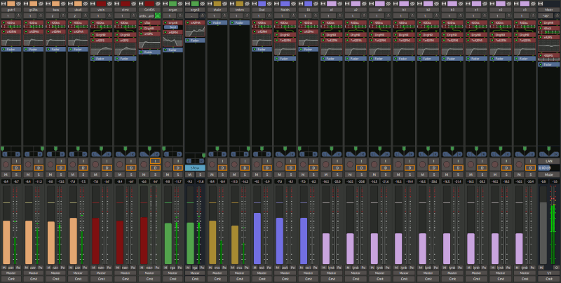 I upgraded to the latest version of Linux Mint last month, and this was my first recording on the new system. During the mixing and mastering we found that the Calf plugins didn’t work, so we went searching the forums to find out why. Apparently those plugins are designed poorly on the back end, and a lead developer of Ardour recommended against using them. I often use the Calf Vintage Delay plugin, so I will have to find a workaround for that. But for this recording we found a workaround for the stereo Multi Spread: I split the organ into two tracks and panned one left and the other right. Then I put an EQ on each channel with complimentary frequency boosts and scoops on the right and left channels, so that the frequencies of the original signal are spread over stereo space. It worked pretty well.